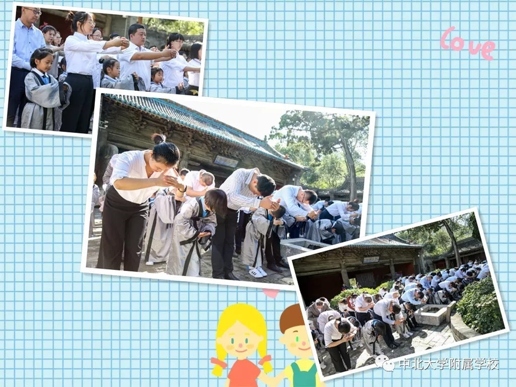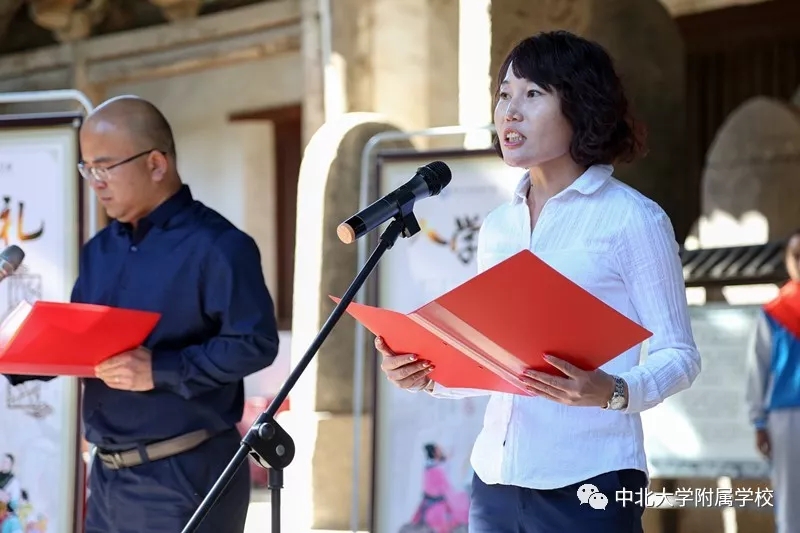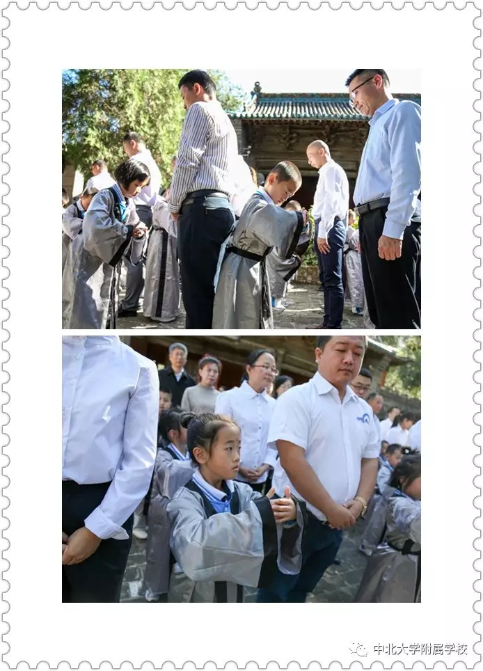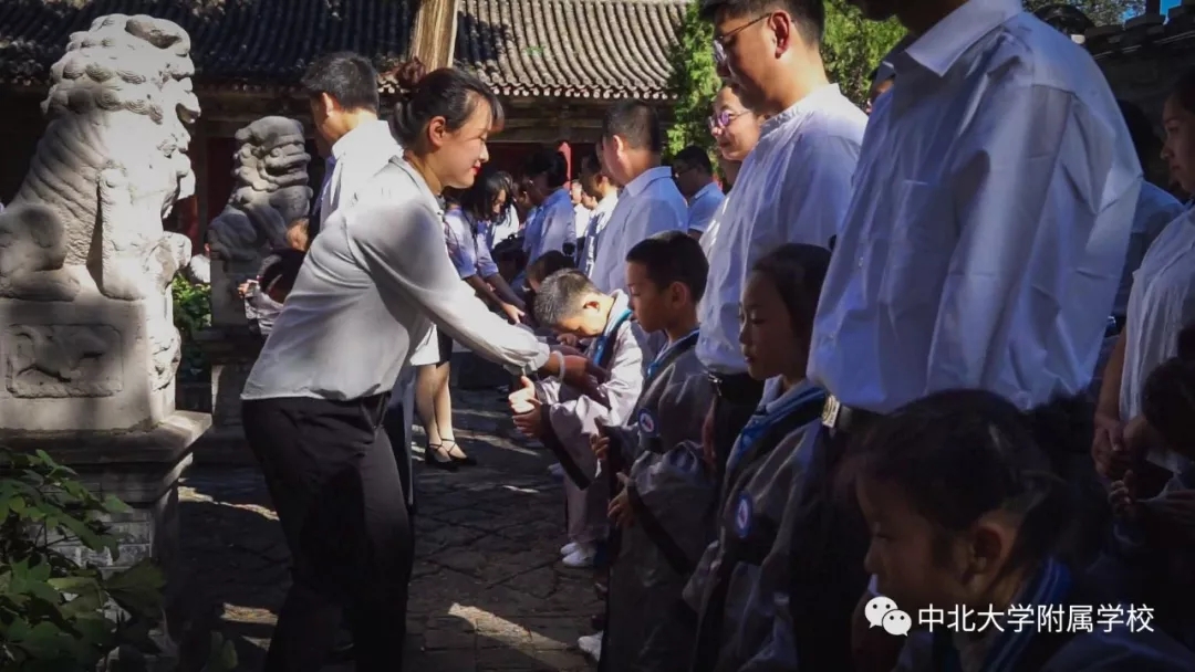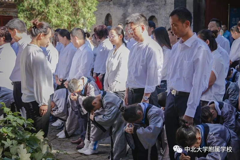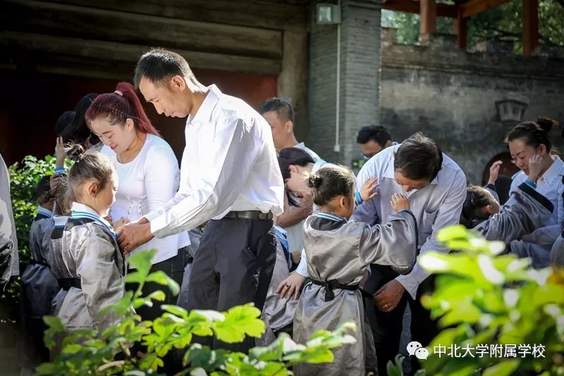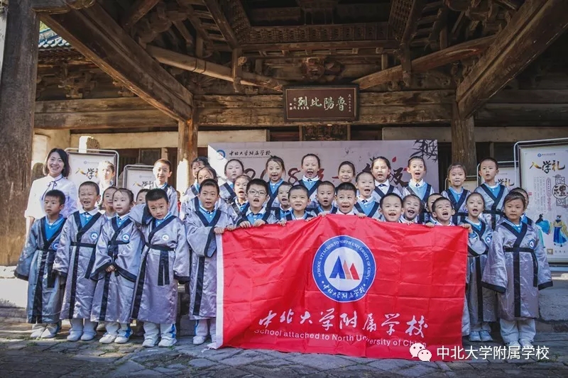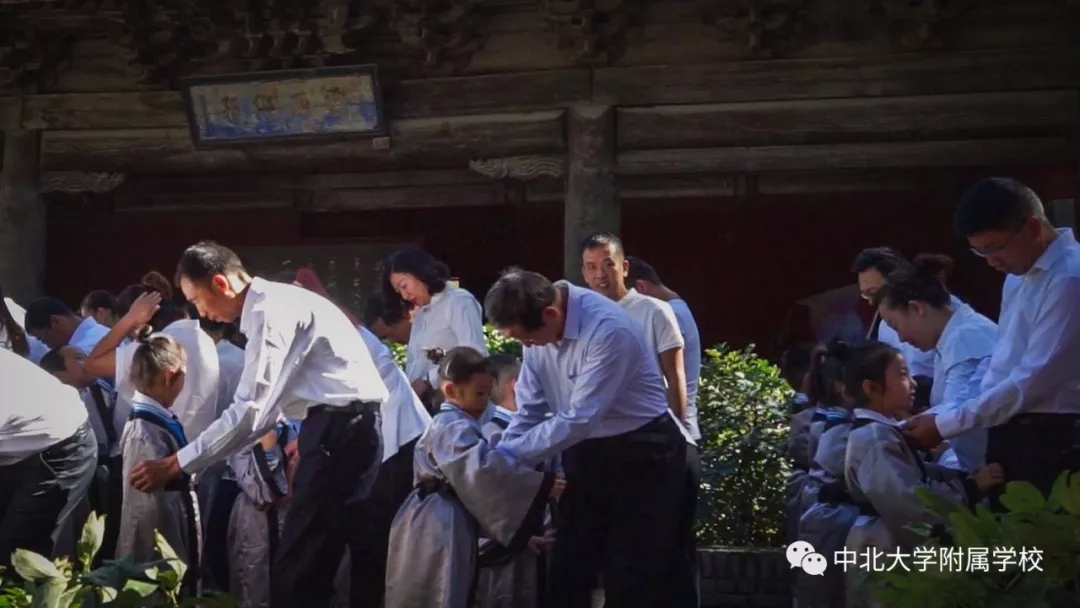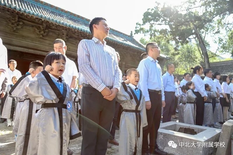 自从汉代以后,入学礼作为人生四大礼之一,受到了格外的重视。无论是进入私塾,还是进入学堂,入学礼使孩童们开启读书识字、背经诵史的历程。在窦大夫祠堂伴着沧桑古砖铺就的天井中洒下斑驳的日影,一群垂髫童子身着汉服,与父母在这里庄严肃立,追寻智者的足迹,聆听圣人的遗音。这是中北大学附属学校于蒙童入学始所举行的“入学礼”仪式。