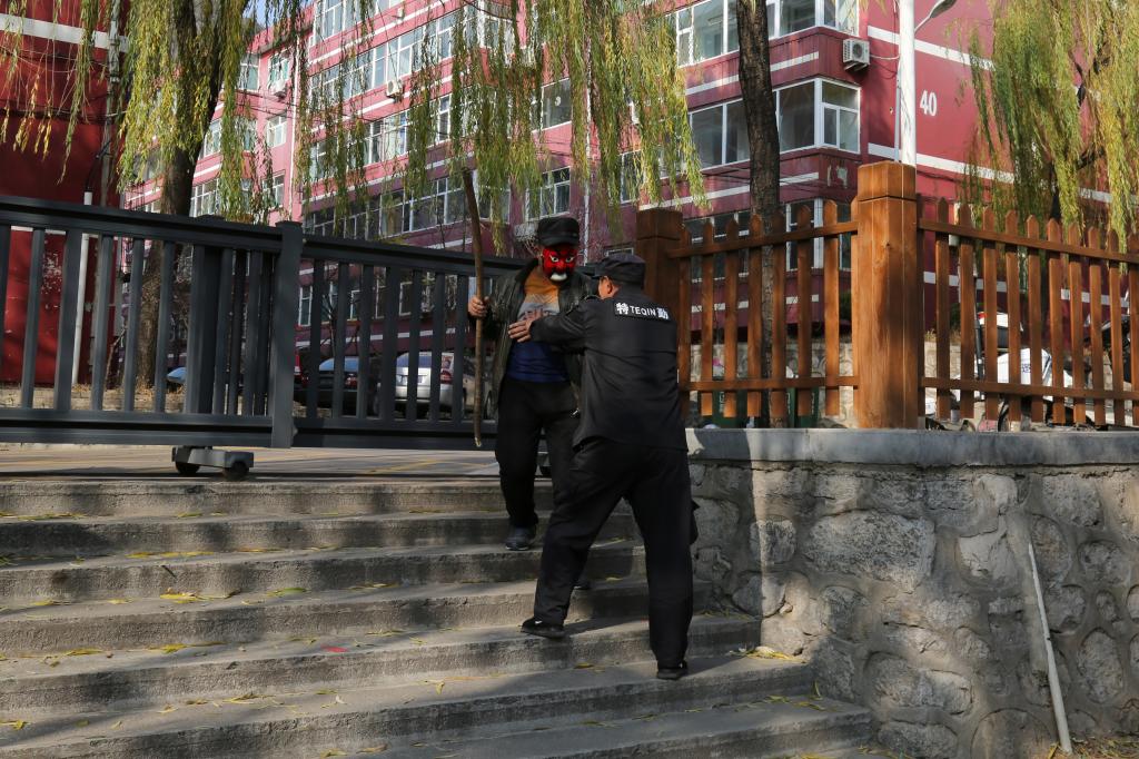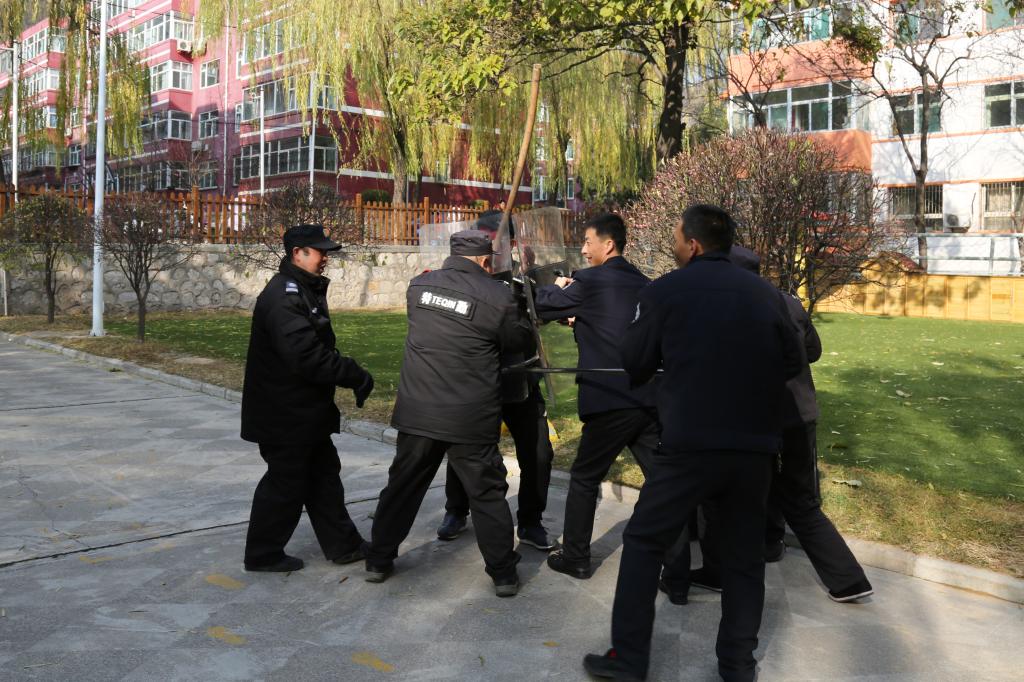 演练前,在校保卫处孙旭东处长的大力支持下,保卫处治安科陈晓东科长及陈洋警员与我园反恐演练小组,针对演练环节、演练内容等做了细致沟通与设定。并深入园所对园所保安,针对器具使用、反恐搏斗等进行了讲解与演示。