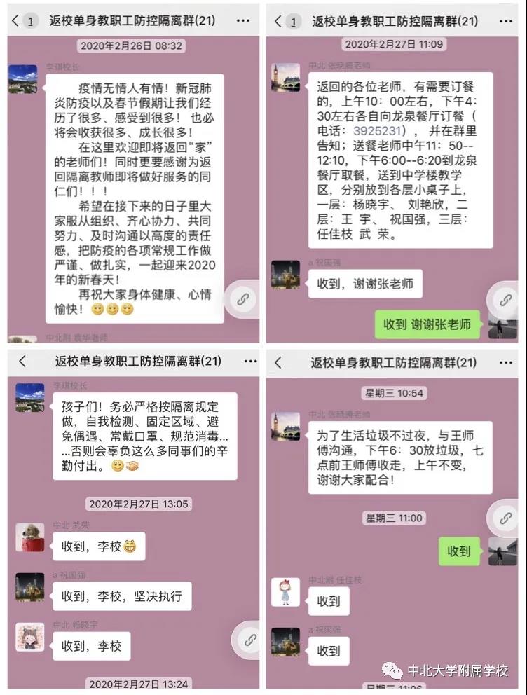 接到学校返校通知后,全体单身教师在保证自身生命健康安全的前提下分批次返回太原。为确保隔离观察效果,学校详细研判,制定了《附属学校关于省内外返校单身教职工防控隔离方案》。单身教职工返校前,学校专门设置了隔离区,准备好消毒工具,为每一名单身教职工提供“一人一室”隔离条件。