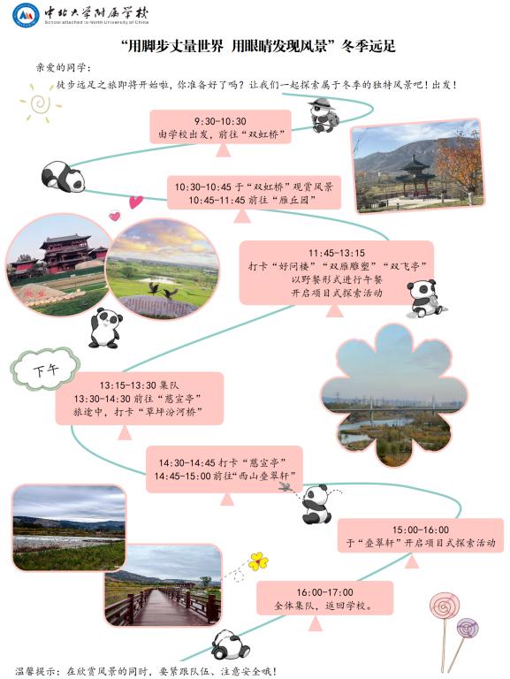 此次雁丘园冬季徒步远足活动,不仅让学生们领略了自然之美、文化之韵,更让他们在实践中学会了合作、学会了坚持、学会了思考。这是一次难忘的旅程,更是一段宝贵的成长经历。让我们期待中北附校的学子们,在未来的日子里,能够继续用脚步丈量世界,用眼睛记录风景,用心灵感受生活,成为有担当、有情怀、有梦想的新时代青年!