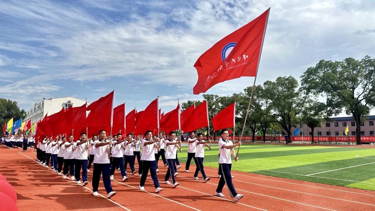 激昂的《运动员进行曲》划破晴空,国旗队与校旗队率先登场,鲜红国旗与校旗并肩舒展,既点燃全场爱国热忱,也增强了师生对学校的向心力。紧随其后的彩旗队挥舞五彩旗帜,花束队迈着轻快步伐,为赛场注入蓬勃朝气。各班方阵依次亮相,初中各方阵身着统一服装,步伐整齐、口号铿锵,尽显少年向阳而生的韧劲与勇毅。小学各方队通过舞蹈情境,以稚嫩脸庞和专注的态度,再现革命先辈砥砺前行的过往足迹。裁判员队伍身着整齐队服入场,步伐沉稳、神情严肃,以挺拔姿态传递公平公正的执裁承诺。