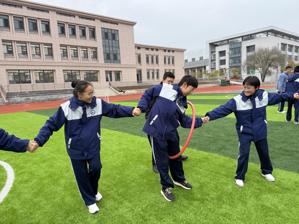 在各位老师的带领下,初三学生积极参与各项活动。在“极速穿越”环节,各班学生在不松手的情况下,逐个穿越“时空圈”。他们心手相连,一起经历,跨越挑战,共同探索,相互支持,不仅增进了同学之间的感情,还在紧张的学习中得以放松。
