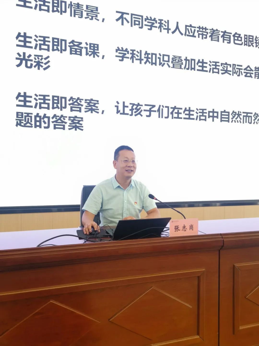 副校长张志岗围绕“守初心,秉真心,铸匠心”三个方面进行阐述,期望全体教师坚守师德底线,减少精神内耗,理解、接受、放下和改变自己,努力实现自我提升。张副校长从地理专业角度出发,结合丰富、真实的生活案例为在座教师上了一堂情境教学的示范课,并提出生活即情境、生活即备课、生活即答案,为学校下一步教学工作提出具体做法与要求,为新学期教师“如何改变、如何发展”指明了方向。