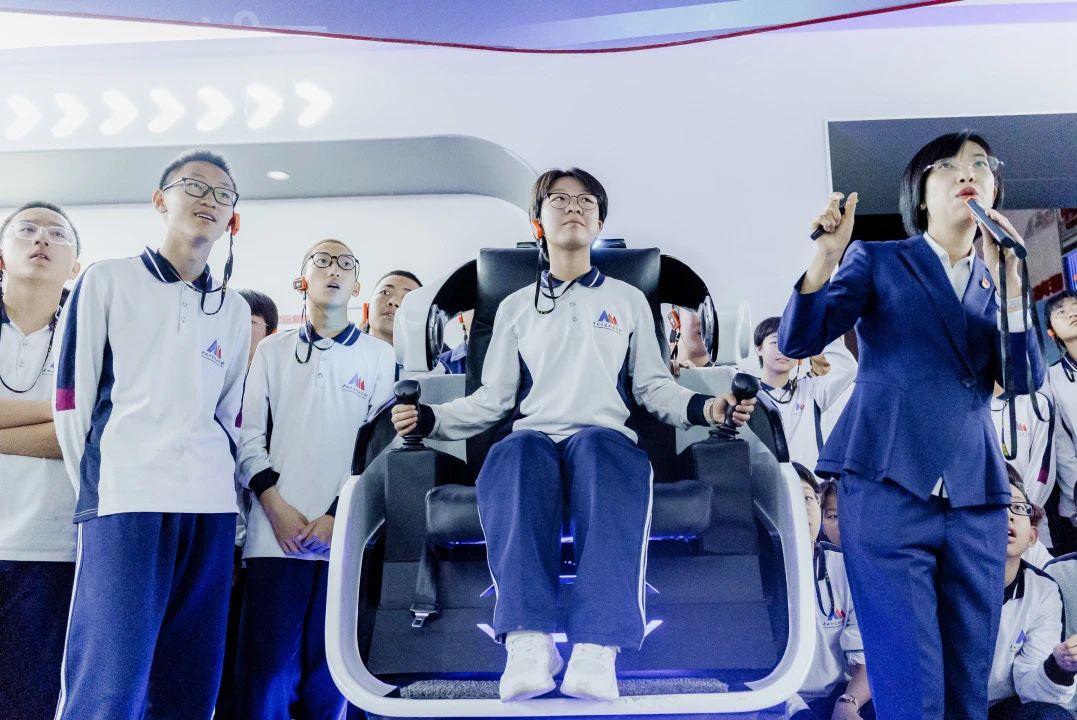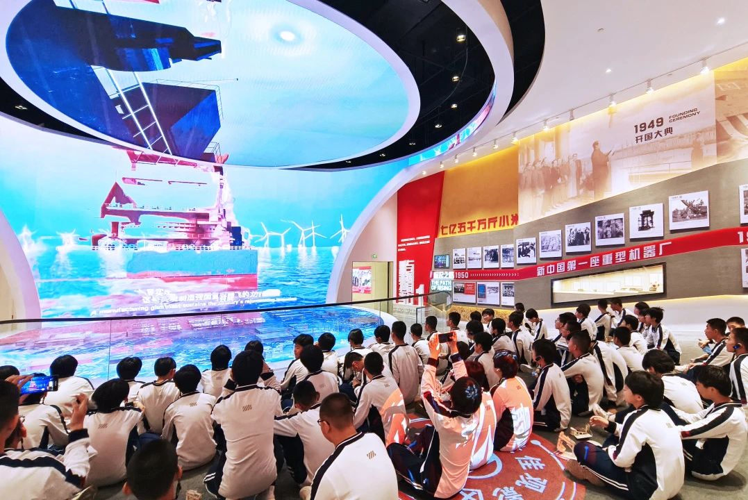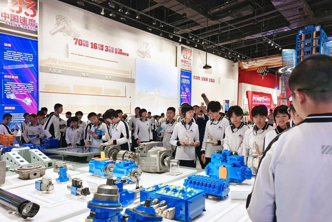 在太重集团展览馆,跨越73年的时光长廊展现了企业从新中国首座重型机械厂到"智造标杆"的奋进历程。同学们通过珍贵影像、航天发射塔架模型等展品,触摸到"工匠精神"的鲜活脉搏;在"万物智联"展区,5G远程操控挖掘机的沉浸式体验,让书本中的智能制造技术跃然眼前。当VR技术将同学们带入2050年智能工厂的数字化图景时,"科技强国"的信念已悄然生根。
